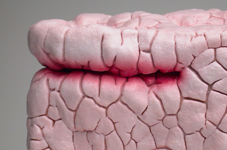 After my first semester in grad school I wanted to start exploring ideas that dealt with issues I felt more strongly about as opposed to the concept of functional vessels that I had been working with during my time as an undergraduate. During a trip to New York I was able to see the work of Carroll Dunham, as well as the rich graffiti that covered certain parts of the city. For me, these images, along with the ideas that were being conveyed, clicked with what I had been thinking about and drawing in my sketchbook. Once I was back I started working on forms that related to intestine-like organs with surfaces that displayed ideas of decadence and sensationalism. I wanted to anthropomorphize the internal forms that mitigated one's external desires.