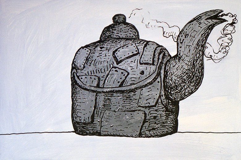 While this is not a foreign concept to me, my interest lies in that there is nothing else in this drawing to place it in the context of reality, no cup, no table, no stovetop. All one has to go on is this kettle, and yet, right away I took for granted that this was a kettle.